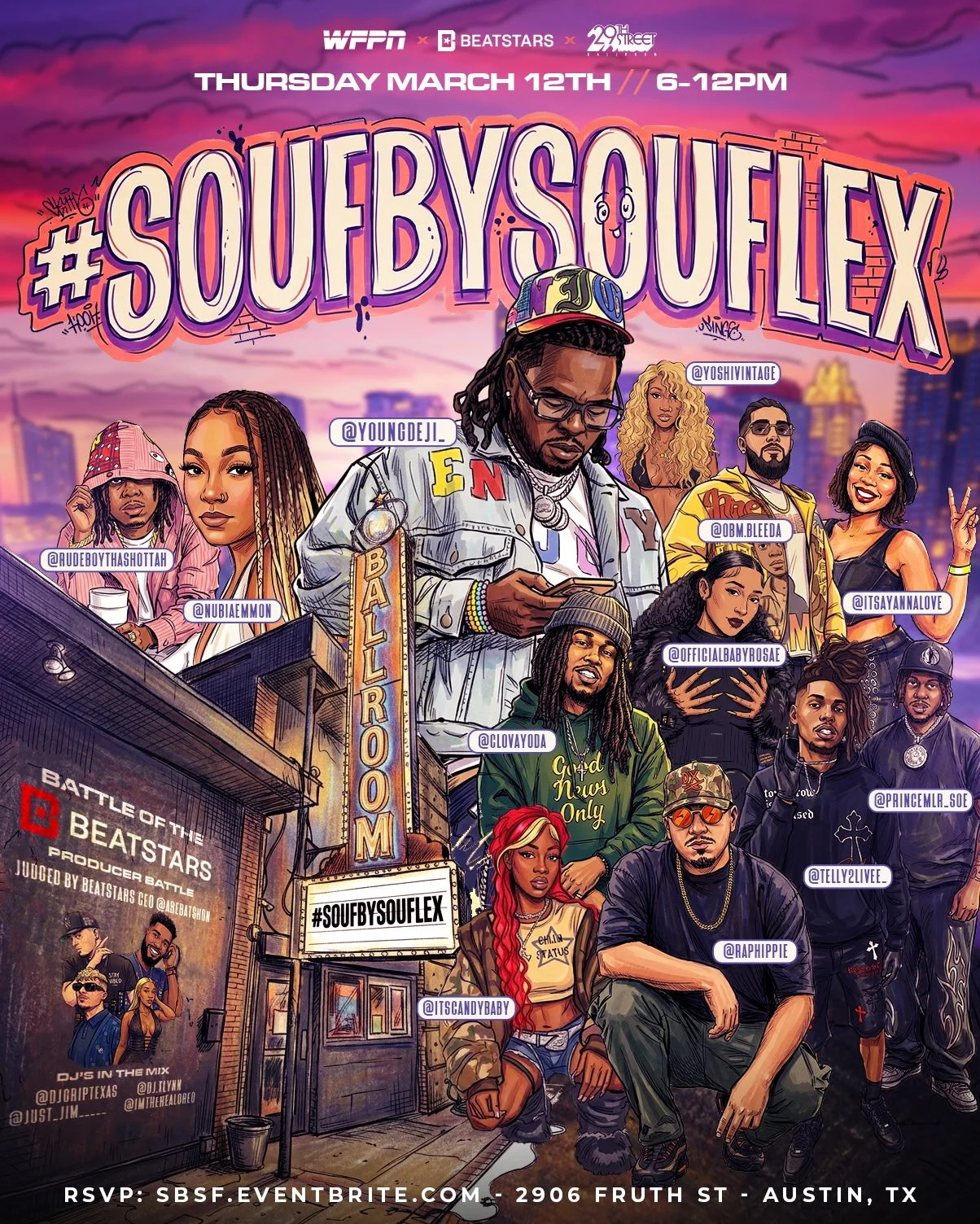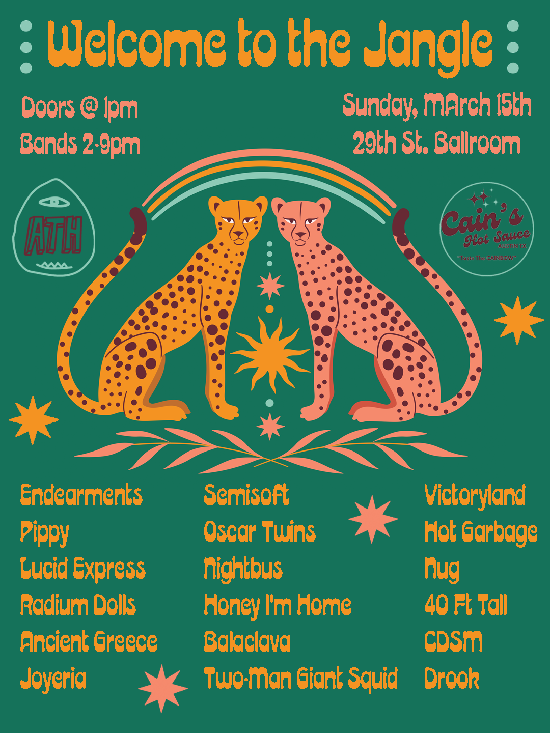 WELCOME TO THE JANGLE PRESENTED BY AUSTIN TOWN HALL AND CAIN'S HOT SAUCE: Ancient Greece, Balaclava, Two-Man Giant Squid, CDSM, Victoryland, Drook, Radium Dolls, Lucid Express, Oscar Twins, Nightbus, Honey I'm Home, Joyeria, Hot Garbage